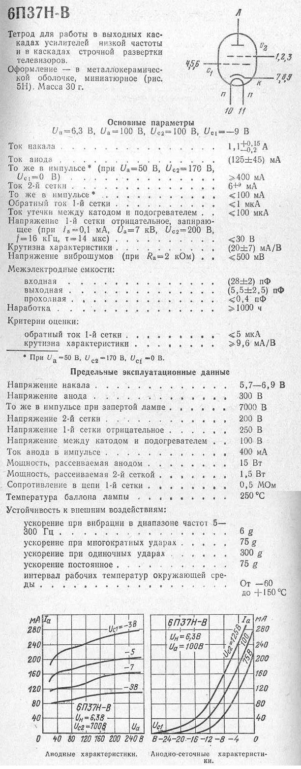 6П37Н-В тетрод-нувистор предназначен для работы в выходных каскадах усилителей низкой частоты. относится к разделу электровакуумных приборов и ламп различного назначения. По конструкции тетрод-нувистор состоит из вакуумно-герметичной, жесткой оболочки, внутри которой отсутствует кислород.