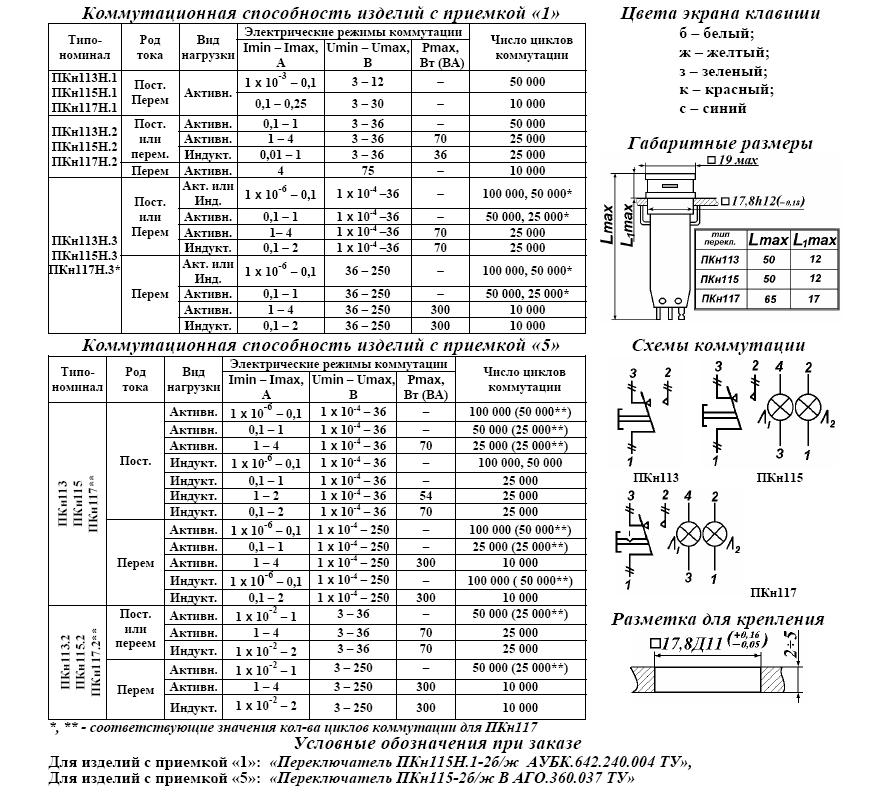 ПКН117-2б/кВ переключатель кнопочный, в том числе со световой индикацией и фиксацией, применяется для коммутации электрических цепей постоянного и переменного тока в радиоэлектронной аппаратуре. Климатическое исполнение В. Переключатели могут изготавливаться с тремя конструктивными исполнениями кнопок: 1 - с одноцветным неразделенным цветовым и световым полем.  2 –двухцветным симметрично разделенным цветовым и световым полем. 3 –двухцветным несимметрично разделенным цветовым и световым полем. Возможно различное сочетание полей.