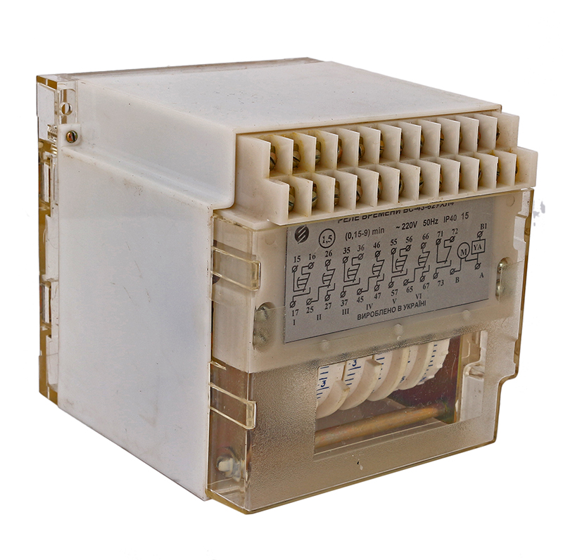 ВС-43-34 0,15-9 ч. 220В реле времени электромеханическое применяется для получения независимой выдержки времени. Реле времени применяется в схемах, где необходимо автоматически выполнить какое-то действие через определенный промежуток времени. Реле электромеханическое, с приводом от синхронного электродвигателя. Механизм реле размещен в пластмассовом корпусе, на лицевой части реле выведен переключатель поддиапазона установок и ручка установки выдержки времени. В комплекте с реле может поставляться колодка для крепления реле.